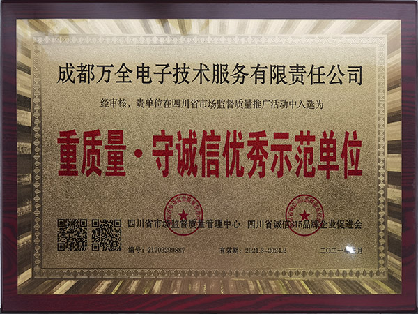 熱烈慶祝成都萬(wàn)全電子榮獲"重質(zhì)量·守誠(chéng)信優(yōu)秀示范單位"稱號(hào)